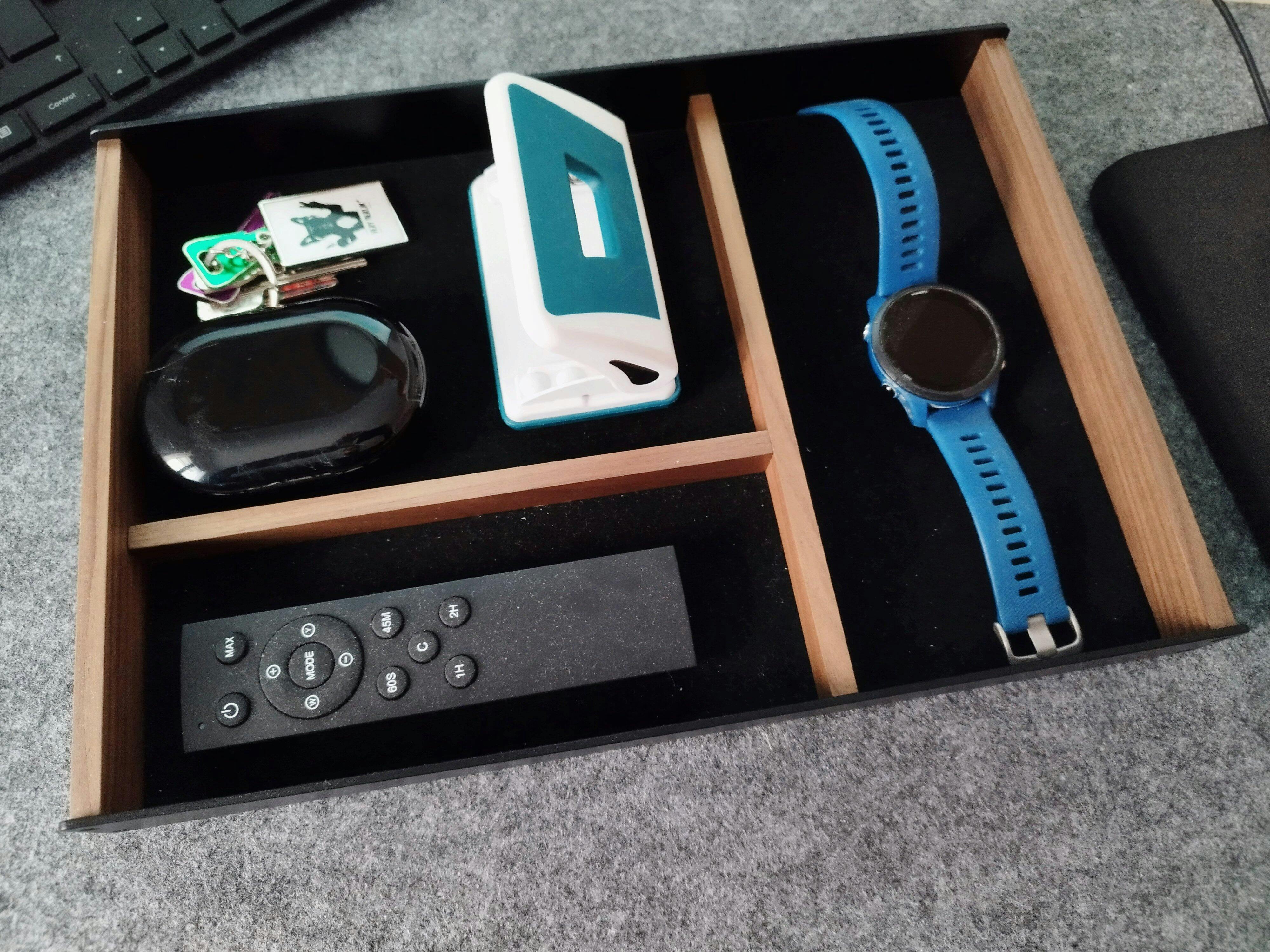 Su diseño con compartimentos divididos permite organizar con elegancia desde bolígrafos y relojes hasta dispositivos y accesorios personales.